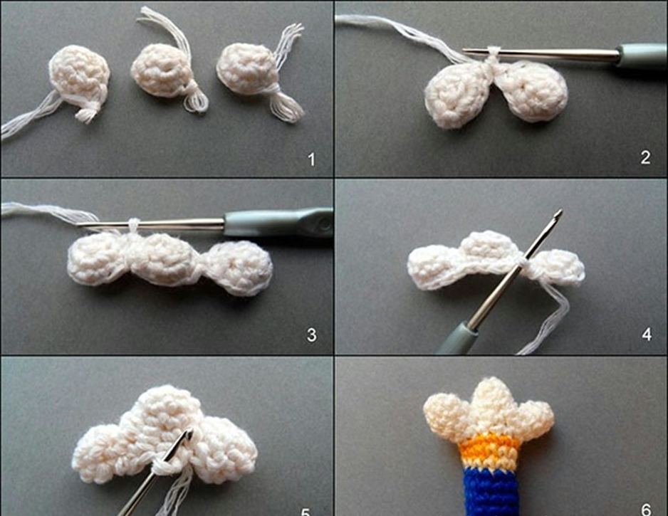 First, 3 “pads” are knitted separately with white yarn (see photo No. 1), then they are connected.