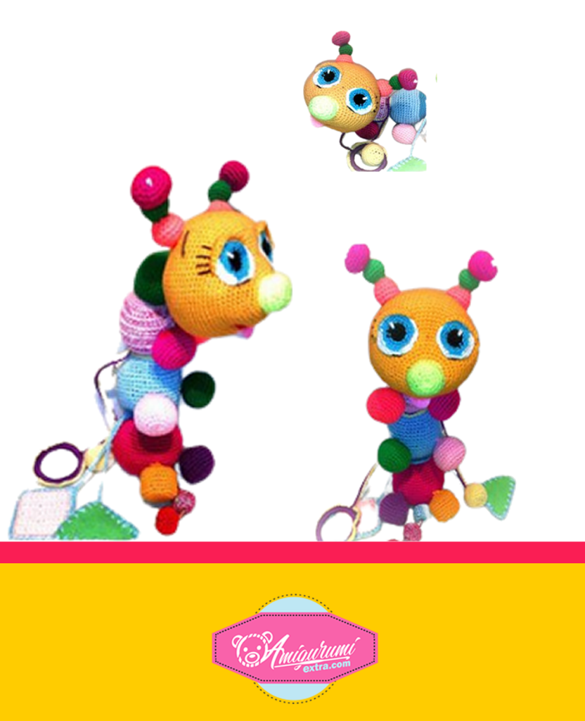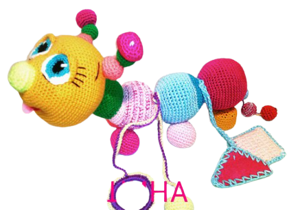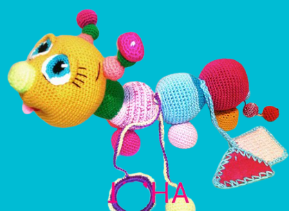 We tie the wooden ring tightly sc. We fasten the thread. Next, we knit 41ch into the last loop, we knit 6 sc, enclose them in a ring and knit them further as balls for the legs. Make sure that your ball fits through the ring. We knit, and then for reliability, we sew our developments to the body of the caterpillar. Our caterpillar development is all ready!